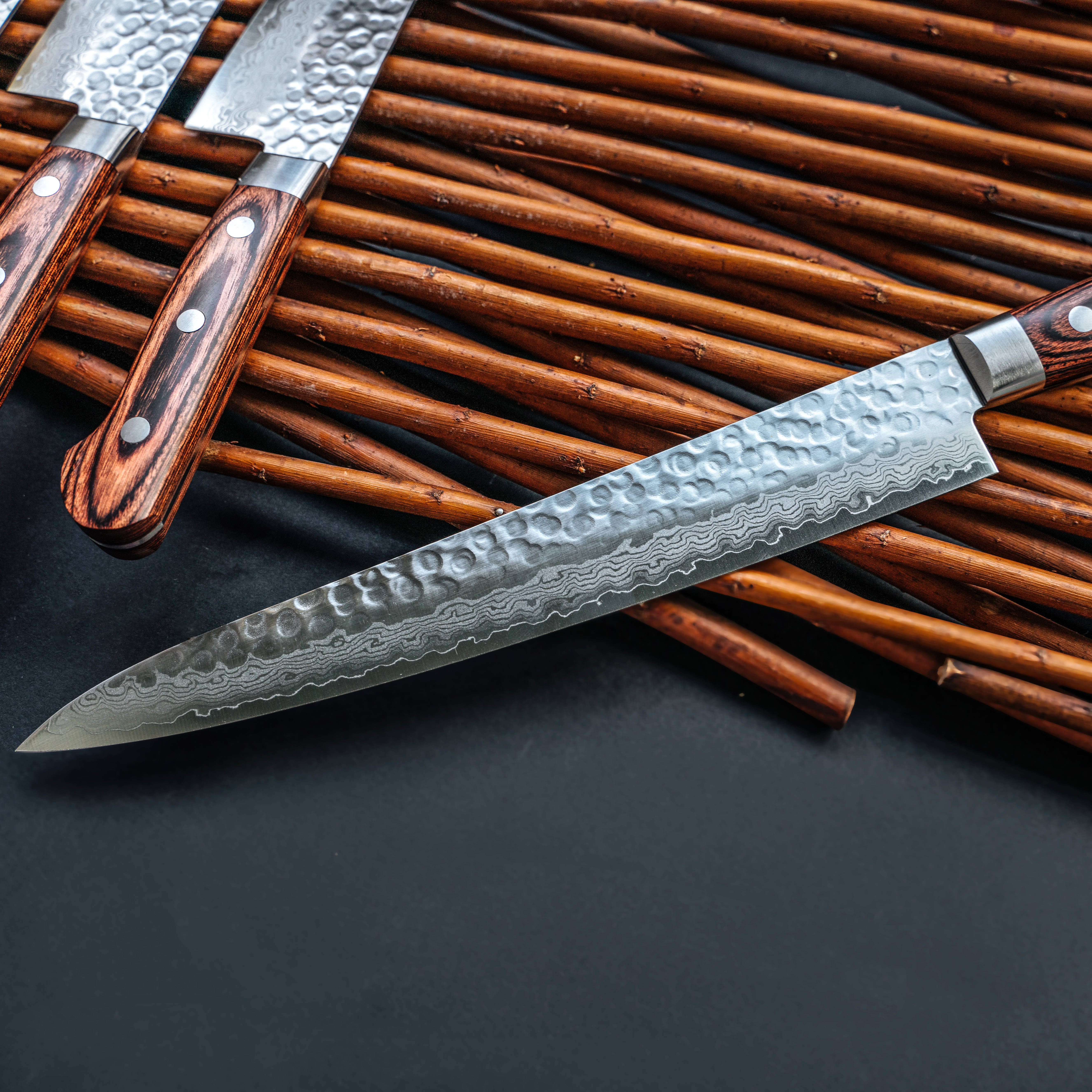 These knives stand out first and foremost because of the steel. Thin, finely balanced, and meticulously crafted, they deliver a cutting experience that feels both controlled and effortless. The blades move cleanly through ingredients, producing precise cuts with minimal resistance. It’s the kind of difference you notice immediately—subtle, but unmistakable—once the knife is in your hand.